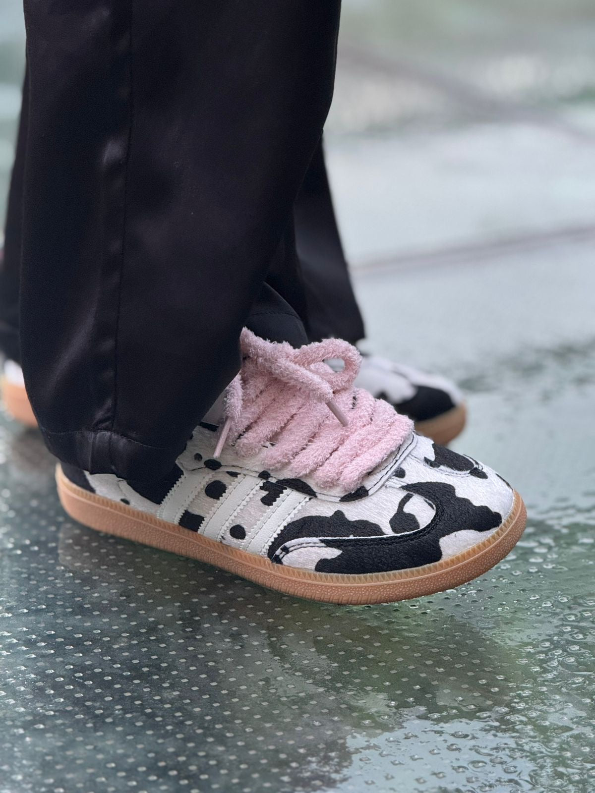 Las Adidas Samba Cow Print Peluche le meten un giro inesperado a un clásico eterno. Nacidas en los 50 como zapatillas de indoor football, las Samba se convirtieron en ícono del streetwear global. Esta versión rompe esquemas con un print de vaca que se roba todas las miradas y cordones de peluche que refuerzan ese vibe irreverente y diferente.